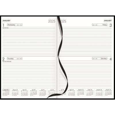 A4 portrait. 2 days per page. Ribbon marker. Sewn, hardcover, book cloth cover.